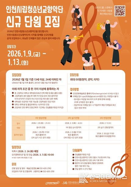 [ 한국미디어뉴스 이원영 기자 ] 인천광역시 문화예술회관이 2026년 창단 예정인 인천시립청소년교향악단에서 활동할 신규 단원을 공개 모집한다.