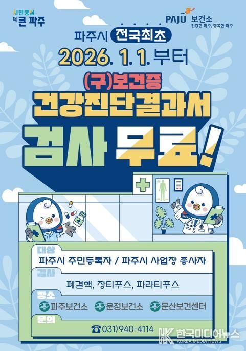 [ 한국미디어뉴스 이원희 기자 ] 파주시가 시민들의 보건 의료 접근성을 획기적으로 높이고 지역사회 감염병 예방에 앞장서기 위해 전국 지방자치단체 최초로 건강진단결과서(구 보건증) 발급 수수료를 전면 무료화한다.
