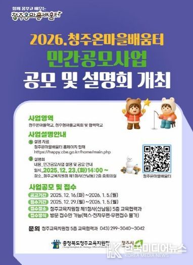 더불어 민간공모사업에 대한 이해를 돕기 위해 사업 설명회도 운영한다. 전체 설명회는 2025년 12월 23일 오후 2시부터, 청주교육지원청 제1청사 2층 중회의실에서 열리며, 12월 29일부터 30일까지는 개별 유선 신청을 통한 추가 설명회도 진행될 예정이다.