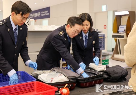 [ 한국미디어뉴스 이원영 기자 ] 관세청은 22일 이명구 관세청장이 인천공항을 찾아, 여행자 휴대품 검사관들과 함께 우범 수하물 선별 및 개장검사, 우범여행자 신체 및 밀리미터파 검색기 운용 등 마약 검사업무를 직접 수행하며 여행자 분야 마약 단속 현장을 점검하고, 지난 5일 발표한 ‘관세청 마약 단속 종합 대책’의 철저한 이행을 주문했다고 밝혔다.