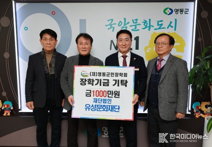 [ 한국미디어뉴스 김풍옥 기자 ] 충북 영동군은 재단법인 유성문화재단이 22일 오후 영동군청을 방문해 지역 인재 육성을 위한 영동군민장학금 1,000만 원을 기탁했다고 밝혔다.