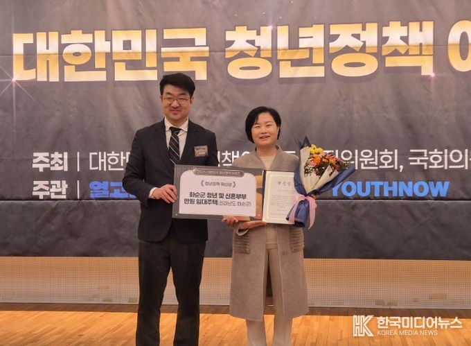 [ 한국미디어뉴스 이종철 기자 ] 화순군은 23일 국회도서관 대강당에서 열린 ‘2025 대한민국 청년정책 어워즈’에서 청년 및 신혼부부 만원임대주택 정책으로 ‘혁신상’을 수상했다고 밝혔다.