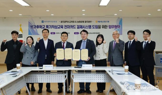 [ 한국미디어뉴스 이종철 기자 ] 광주시교육청은 23일 시교육청 특수교육지원센터에서 NH농협은행 광주본부와 ‘특수교육대상학생 방과후 특기·적성지원 전자카드 결제시스템 도입을 위한 업무협약’을 체결했다.