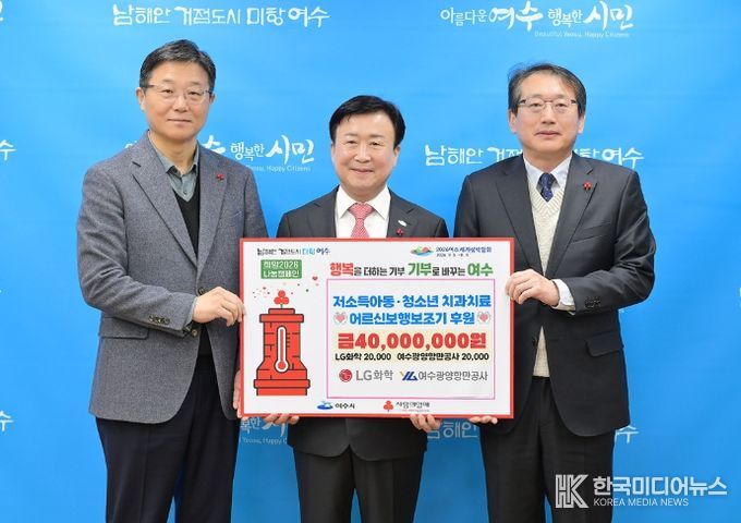 [ 한국미디어뉴스 이종철 기자 ] 여수시는 LG화학 여수공장(주재임원 이현규)과 여수광양항만공사(사장직무대행 황학범)가 지난 23일 저소득 아동·청소년 치과치료 지원사업과 노인 보행 보조기 지원사업 추진을 위해 2천만 원씩 총 4천만 원을 후원하는 증서를 전달했다고 밝혔다.