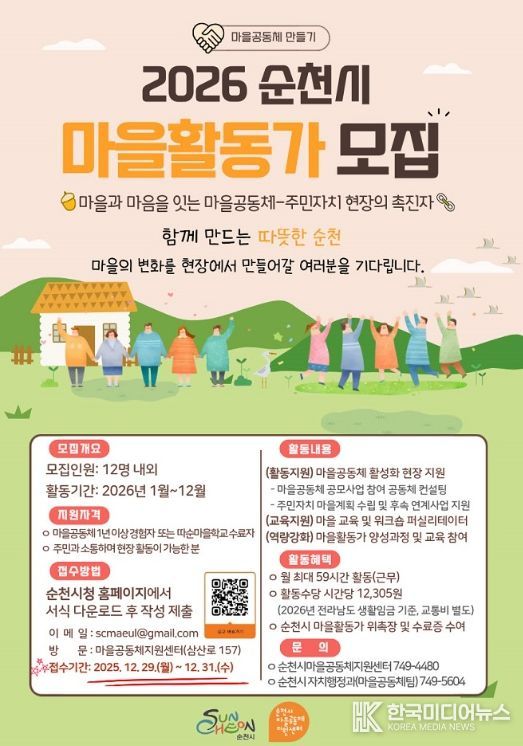 [ 한국미디어뉴스 이종철 기자 ] 순천시는 마을공동체 만들기 공모사업의 원활한 추진과 주민자치·마을공동체 활성화 등 따뜻한 순천을 함께 만들어갈 2026년 마을활동가 12명을 모집한다고 밝혔다.
