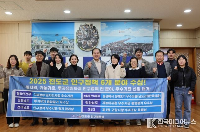[ 한국미디어뉴스 이종철 기자 ] 진도군이 2025년 한 해 동안 인구정책 6개 분야에서 잇따라 우수기관으로 선정되며, 인구정책 추진 성과를 대외적으로 인정받았다.