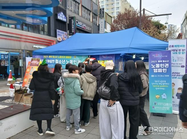 [ 한국미디어뉴스 김풍옥 기자 ] 충청북도교육청은 24일, 청주 성안길 일대에서 겨울방학을 맞아 아르바이트 등 노동 현장에 나서는 청소년들을 보호하기 위해 2025 청소년 노동인권 홍보 캠페인을 실시했다.