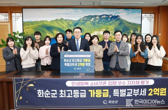[ 한국미디어뉴스 이종철 기자 ] 화순군은 24일 행정안전부가 주관한 ‘민생회복 소비쿠폰 집행 우수 지자체 평가’에서 최우수 지자체로 선정돼 특별교부세 2억 원을 확보했다고 밝혔다.
