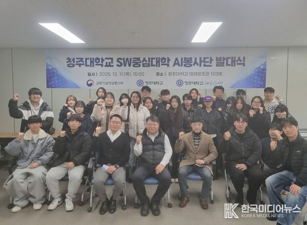 [ 한국미디어뉴스 김풍옥 기자 ] 충청북도는 12월 11일 청주대학교 미래창조관에서 청주대학교 AI봉사단(1기, 30명)을 출범하고, 도내 AI 역량 강화를 위한 지역 밀착형 교육을 본격 추진한다고 밝혔다.