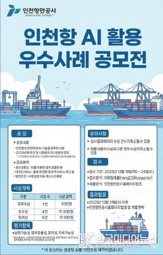 [ 한국미디어뉴스 이원영 기자 ] 인천항만공사(사장 이경규, 이하 인천항만공사)는'2025년 인천항 혁신을 위한 AI 활용 우수사례 공모전'을 개최한다고 밝혔다.