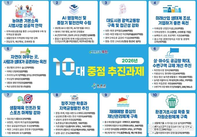 [ 한국미디어뉴스 김풍옥 기자 ] 옥천군이 26일 2026년 군정 운영의 핵심 방향을 담은 10대 중점 추진과제를 발표하고, 군민 삶의 질 향상과 지속가능한 지역성장을 위한 정책 추진에 나선다.
