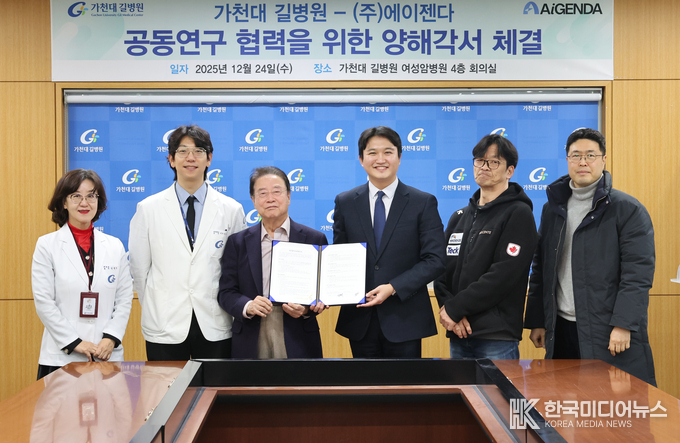 가천대 길병원과 에이젠다는 24일 여성암병원 4층 회의실에서 ‘다기관-멀티모달 연합학습 기반 의료인공지능 기술 시범모델 개발(FLAME-ARK)’ 사업의 성공적인 수행을 위한 업무협약(MOU)을 체결했다.