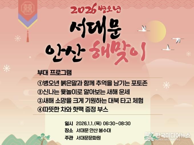 [ 한국미디어뉴스 이원영 기자 ] 서대문구는 2026년 1월 1일 일출 조망 명소인 관내 안산(鞍山) 봉수대 인근에서 서대문문화원 주관으로 새해 소망을 기원하는 해맞이 행사가 열린다고 밝혔다.