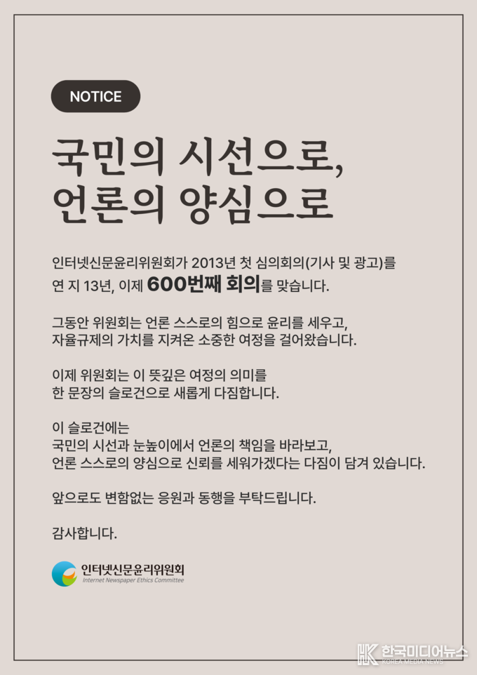 2012년 12월 출범한 인터넷신문 유일의 독립적 자율규제·윤리기구인 인신윤위는 지난 10월 기사 및 광고 심의분과회의 누적 600회 개최를 맞았다. 이를 기념해 국민의 눈높이에서 언론의 공적 책임을 바라보고, 언론 스스로의 윤리의식과 자정 의지를 기반으로 신뢰를 세워가겠다는 의미를 담아 “국민의 시선으로, 언론의 양심으로”라는 슬로건을 발표했다.