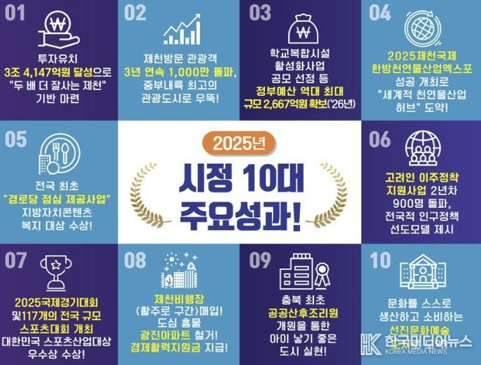 [ 한국미디어뉴스 김풍옥 기자 ] 제천시가 2025년 한 해를 마무리하며 ‘역동적이고 새로운 경제도시 제천’ 실현을 목표로 13만 시민과 1,200여 공직자의 열정과 노력을 바탕으로 거둔 올해의 10대 성과를 선정해 발표했다.