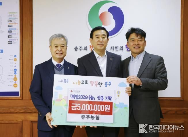충주농협은 시청을 방문해 ‘희망2026나눔캠페인’ 기금 500만 원을 기탁하면서 지역사회를 훈훈하게 하고 있다.
