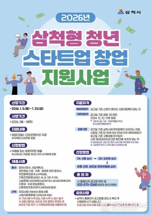 [ 한국미디어뉴스 이원영 기자 ] 삼척시가 혁신적인 창업 아이디어를 보유한 청년들의 창업 도전을 지원하기 위해 '2026년 삼척형 청년 스타트업 창업 지원사업' 참여자를 모집한다고 밝혔다.
