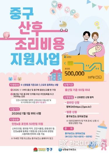[ 한국미디어뉴스 최치남 기자 ] 인천시 중구는 출산 가정의 경제적 부담을 덜어주기 위해 새해인 오는 2026년 1월 1일부터 ‘중구 산후조리비 지원 사업’을 본격적으로 시작한다고 밝혔다.