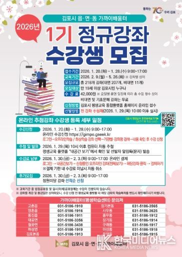 [ 한국미디어뉴스 이원희 기자 ] 김포시는 시민의 평생학습 참여 기회를 확대와 지역 밀착형 학습 환경 조성을 위해 2026년 읍면동 가까이배움터 제1기 수강생을 모집한다고 밝혔다.