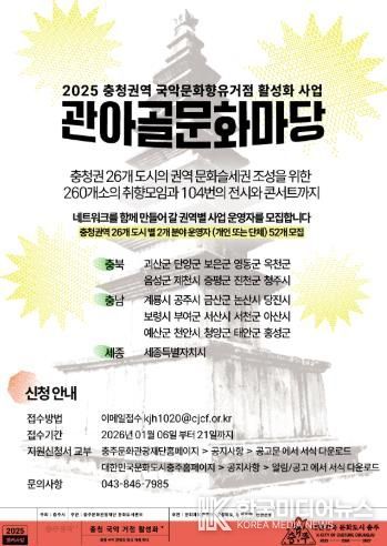 [ 한국미디어뉴스 김풍옥 기자 ] 충주문화관광재단과 충주시는 정부의 지방시대 핵심 비전인 ‘5극 3특(5대 초광역권 및 3대 특별자치도)’ 전략에 발맞춰, 충청권역의 문화적 연대를 강화하고 지역 균형 성장을 견인할 '충청권 국악문화향유거점 활성화 사업' 운영자를 오는 21일까지 공개 모집한다.