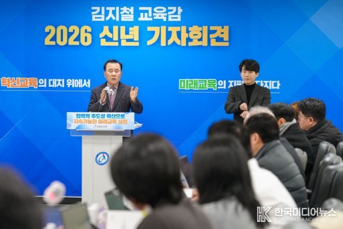 [ 한국미디어뉴스 이원영 기자 ] 김지철 충남교육감은 8일, 도교육청 회의실에서 ‘2026 신년 기자회견’을 열고, ‘2025년 주요 성과와 2026년 12대 중점 추진 과제’를 발표했다.