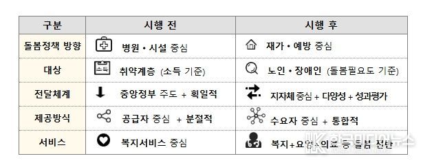 우선 돌봄의 중심이 병원·시설에서 재가·예방으로 옮겨져, 입원·입소 경계선상의 노인·장애인 등이 살던 곳에서 필요한 서비스를 지원받을 수 있게 된다. 소득 기준 중심의 지원에서 벗어나, 노인·장애인의 돌봄 필요도를 기준으로 서비스를 연계해 제공함으로써 사각지대를 줄인다.