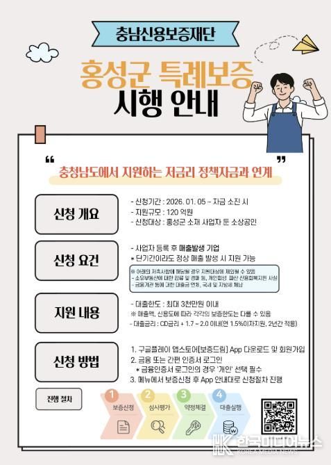 [ 한국미디어뉴스 이원영 기자 ] 홍성군은 경기 둔화와 고금리·고물가 상황이 지속됨에 따라 자금 조달과 경영 운영에 어려움을 겪고 있는 관내 소상공인의 금융 부담을 완화하고자 ‘2026년 소상공인 특례보증 지원사업’을 시행한다고 밝혔다.