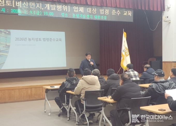 이번 교육은 2025년 농지법 개정으로 농지개량행위 신고제 도입과 성토·절토 기준이 대폭 강화됨에 따라, 농지 성토기준 미이행 등 불법 성토와 오염토 반입으로 인한 농지 훼손 및 환경오염을 근본적으로 차단하기 위해 마련됐다.