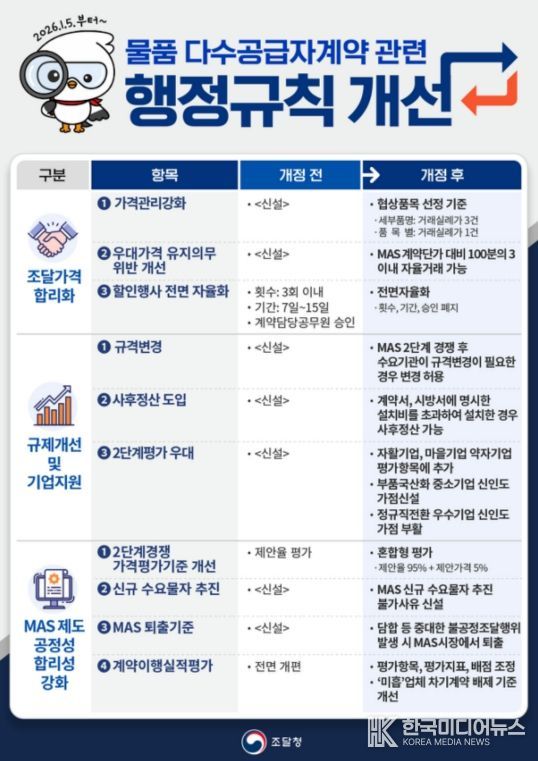 [ 한국미디어뉴스 황영수 기자 ] 조달청은 조달 가격의 신뢰성을 높이고, 공공조달에 남아 있는 불합리한 규제를 혁파하기 위해 '물품 다수공급자계약 관련 행정규칙 2종'을 개정하여 2026년 1월 5일부터 시행했다고 밝혔다.