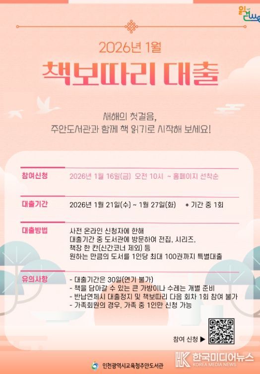 [ 한국미디어뉴스 이원영 기자 ] 인천광역시교육청주안도서관은 지역주민의 독서문화 정착과 대출 활성화를 위하여 2025년에 이어 올해도 '책 보따리 대출'을 실시한다고 14일 밝혔다.