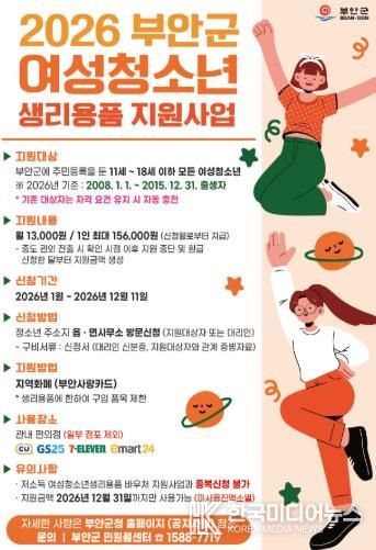 부안군 관계자는 “여성청소년 생리용품 지원은 신청한 달부터 지원받을 수 있으므로, 특히 1월 집중신청기간에 대상 청소년들이 빠짐없이 혜택을 받을 수 있기를 바란다”고 말했다.