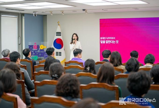 [ 한국미디어뉴스 이원영 기자 ] 서울 동대문구는 14일 구청 5층 기획상황실에서 구청장과 6급 팀장 이상 관리자를 대상으로 ‘스피치 역량 강화 특강’을 열었다. 정책 설명과 내부 소통, 대민 응대 등 행정 현장에서 관리자의 말 한마디가 곧 조직의 신뢰로 이어지는 만큼, 공적 커뮤니케이션의 기본기를 점검하고 현장 적용력을 끌어올리기 위한 자리였다.