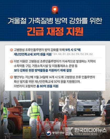 - 행안부는 지난해 11월 24일에 14개 시·도에 고병원성 조류인플루엔자 확산 방지를 위한 재난안전특교세 50억 원을 지원했으며 이번까지 포함하면 총 80억 원을 지원