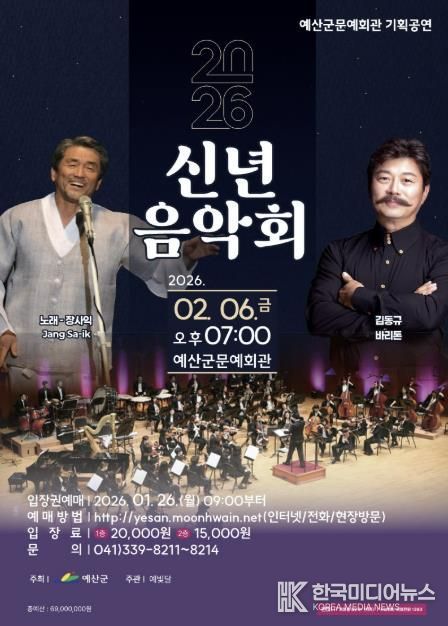 [ 한국미디어뉴스 이원영 기자 ] 예산군은 군민과 함께 희망찬 2026년 새해를 여는 ‘2026년 신년 음악회’를 오는 2월 6일 오후 7시 예산군문예회관 공연장에서 개최한다고 밝혔다.
