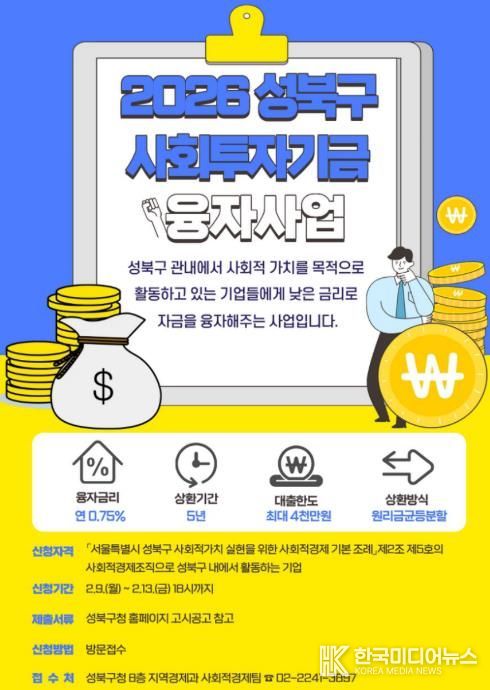 [ 한국미디어뉴스 이보영 기자 ] 서울 성북구가 ‘2026년 상반기 사회투자기금 융자 지원 사업’을 실시한다. 경제적 어려움을 겪는 관내 사회적경제 조직의 안정적인 운영을 돕기 위해서다.