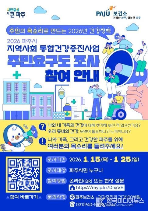 [ 한국미디어뉴스 이원희 기자 ] 파주시는 시민의 건강한 삶을 지원하기 위해 '2026년 지역사회 통합건강증진사업’추진에 앞서 주민건강요구도 조사를 실시한다.