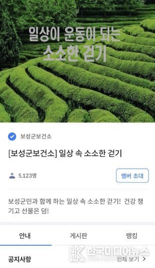 [ 한국미디어뉴스 이종철 기자 ] 보성군은 2026년 한 해 동안 군민 누구나 참여할 수 있는 모바일 앱 활용 비대면 건강 증진 프로그램인 ‘소소한 걷기 챌린지’를 연중 운영한다고 밝혔다.