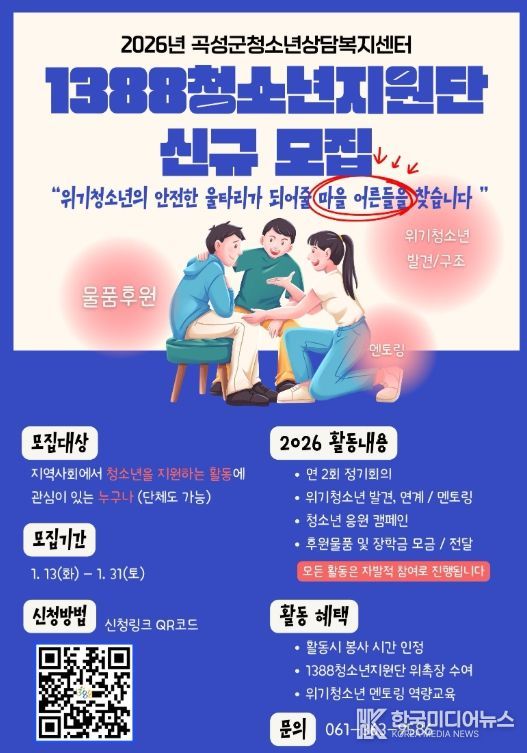 [ 한국미디어뉴스 이종철 기자 ] 전남 곡성군은 관내 소재한 곡성군청소년상담복지센터에서 지역 내 위기청소년을 조기에 발견하고 실질적인 지원을 제공하기 위한 민·관 협력 조직인 ‘1388청소년지원단’의 2026년도 신규 단원을 모집한다고 16일 밝혔다.