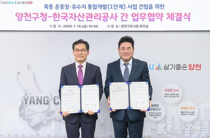 [ 한국미디어뉴스 이보영 기자 ] 양천구가 1월 16일 한국자산관리공사와 업무협약을 체결하며, 목동운동장·유수지 일대 통합개발(목동MICE)을 위한 첫걸음을 내디뎠다.