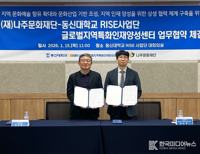 나주문화재단(이사장 윤병태)은 동신대학교 RISE사업단 글로벌지역특화인재양성센터(센터장 임순호)와 지난 15일 지역 문화예술 향유 확대와 문화산업 기반 조성, 청년 인재 양성을 위한 업무협약을 체결했다고 16일 밝혔다.