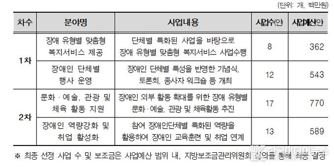 지원사업 1차 공모는 오는 23일(금) 18시까지로 ▴장애 유형별 맞춤형 복지서비스 제공 ▴장애인 단체별 행사 운영 분야를 대상으로 진행되며 결과는 2월 중 발표할 예정이다. 2차 공모 접수는 2월 10일부터 2월 20일 18시까지이며 ▴문화·예술·관광·체육활동 ▴장애인 역량 강화 및 취업 활성화 분야이다.