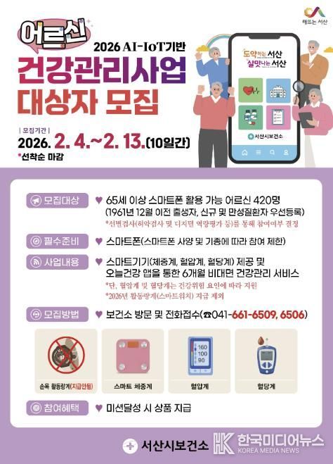 [ 한국미디어뉴스 이원영 기자 ] 충남 서산시가 인공지능(AI)·사물인터넷(IOT) 기반 어르신 건강관리사업의 대상자를 모집한다고 밝혔다.