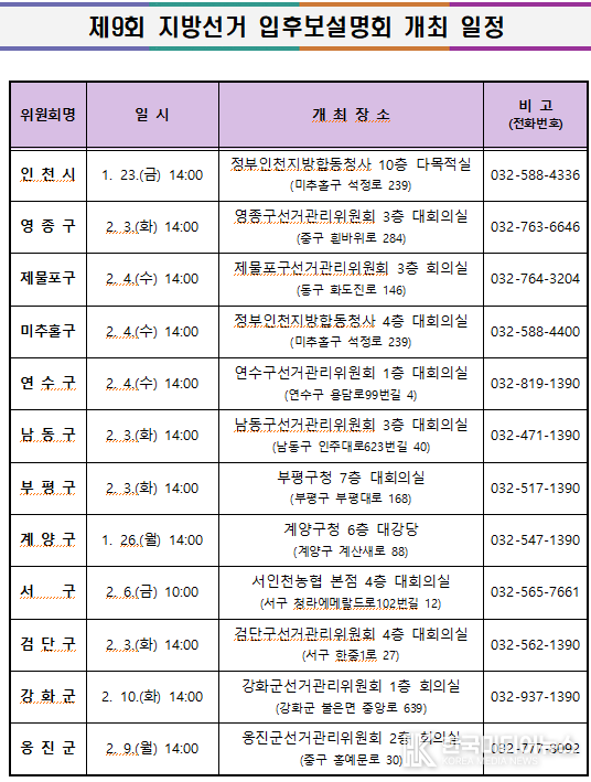 ※ 계양구선관위의 경우 국회의원보궐선거(계양구을선거구)에 대한 입후보설명회를 함께 진행함.