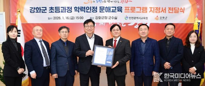 [ 한국미디어뉴스 이원영 기자 ] 인천광역시교육청은 강화군 내 저학력 성인의 기초학력 지원을 위해, 강화군청을 ‘초등 학력인정 문해교육 프로그램’ 운영기관으로 지정하고, 16일 지정서를 전달했다.