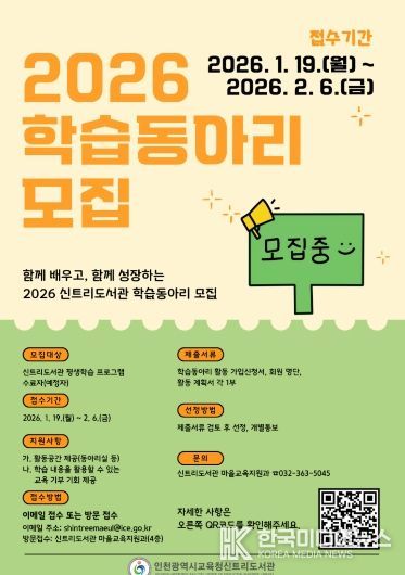 [ 한국미디어뉴스 이원영 기자 ] 인천광역시교육청신트리도서관은 지역주민의 자발적인 학습 문화 조성과 지속 가능한 마을 학습공동체 형성을 위해 2026년 학습동아리를 모집한다.