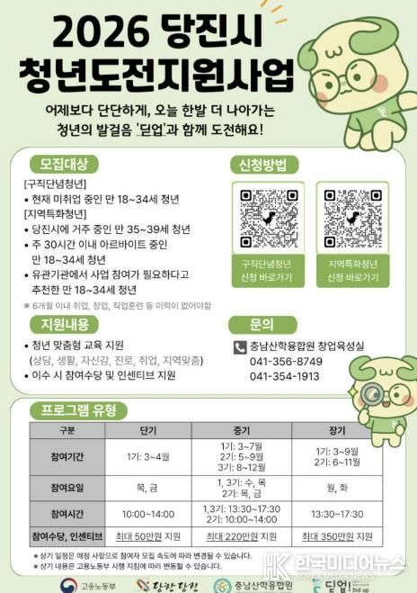 [ 한국미디어뉴스 이원영 기자 ] 당진시는 고용노동부가 주관하는‘청년도전지원사업’에 올해에도 선정돼 연중 참여자를 모집한다고 20일 밝혔다.