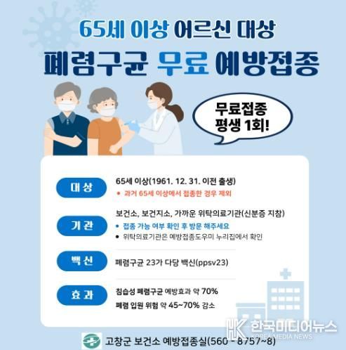 [ 한국미디어뉴스 이종철 기자 ] 고창군보건소가 1961년생 이상 어르신을 대상으로 폐렴구균 예방접종을 무료로 실시한다.