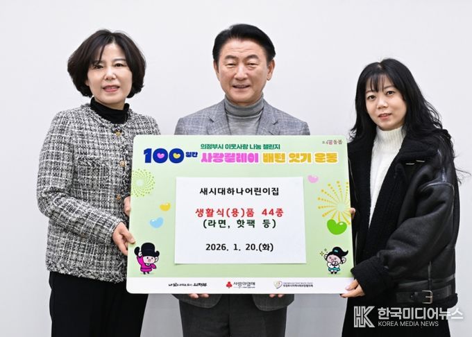 [ 한국미디어뉴스 김서안 기자 ] 의정부시는 1월 20일 새시대하나어린이집이 ‘100일간 사랑릴레이 배턴 잇기’에 동참해 관내 저소득층을 위한 생활식(용)품 44종(라면, 핫팩 등)을 기부했다고 밝혔다.
