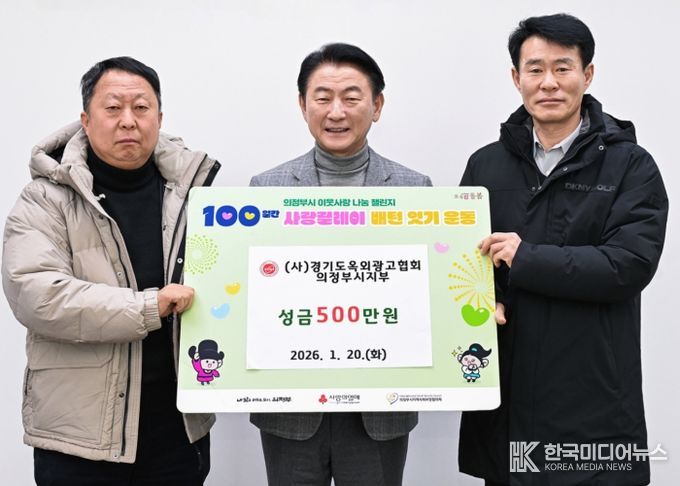 [ 한국미디어뉴스 김서안 기자 ] 의정부시는 1월 20일 (사)경기도옥외광고협회 의정부시지부가 ‘100일간 사랑릴레이 배턴 잇기’에 동참해 성금 500만 원을 기탁했다고 밝혔다.