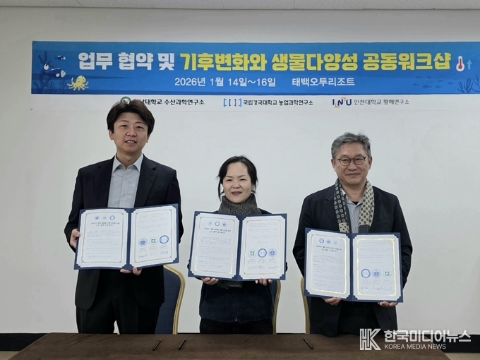 [ 한국미디어뉴스 이원영 기자 ] 인천대학교(총장 이인재) 황해연구소(소장 이재성)는 지난 1월 16일 국립대 중점연구소인 전남대학교 수산과학연구소와 경국대학교 농업과학연구소와 함께 기후위기 대응을 위한 지역 거점 연구 활성화 및 전문인력 양성을 목표로 업무협약(MOU)을 체결했다.